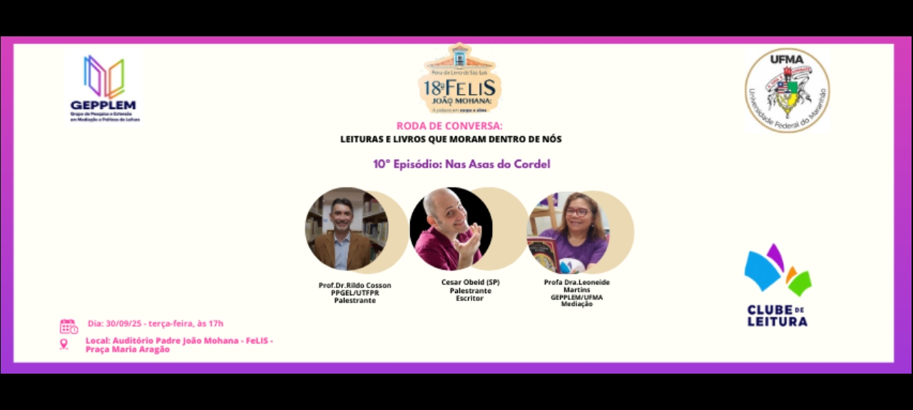 O GEPPLEM/UFMA, em parceria com a coordenação da FELIS, realizará no dia 30/09, às 17h, o 10º Episódio da Roda de Conversa “Leituras e Livros que moram dentro de Nós”, com a temática NAS ASAS DO CORDEL, com a participação do Prof. Dr. Rildo Cosson e escritor/poeta Cesar Obeid, mediada pela Profa. Dra. Leoneide Martins. Teremos também a apresentação do cordel "Poéticas Verdes da ilha", pelos alunos do 5º ano do COLUN, sob a coordenação da Profa. Aldenora Neta.