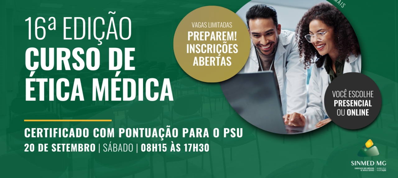 O 16º Curso de Ética Médica é uma iniciativa do Sinmed-MG será realizado em 20 de setembro/2025 e vai abordar temas fundamentais para os acadêmicos e médicos, orientando-os na conduta ética e carreira profissional. É destinado a acadêmicos de medicina e médicos ( filiados e não filiados) e o certificado emitido, TEM PONTUAÇÃO PARA O PSU.