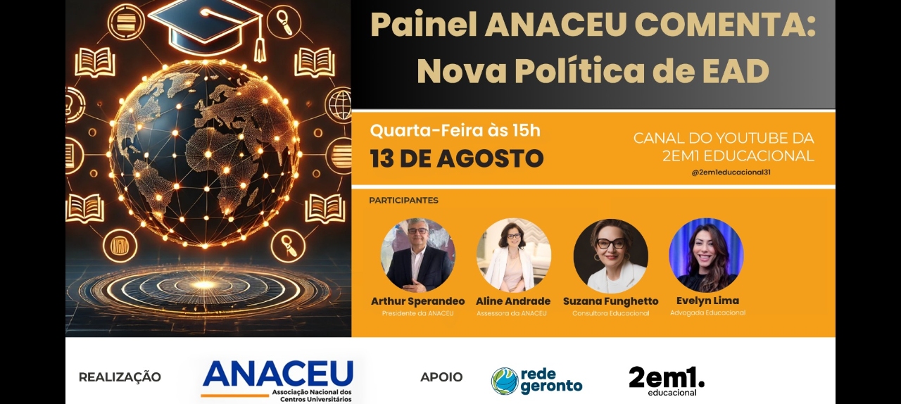 A Associação Nacional das Instituições de Ensino Superior — ANACEU, em parceria com a 2 em 1 Educacional, tem a satisfação de convidá-lo(a) para participar do Painel ANACEU COMENTA, que abordará o tema: Nova Política de EAD.