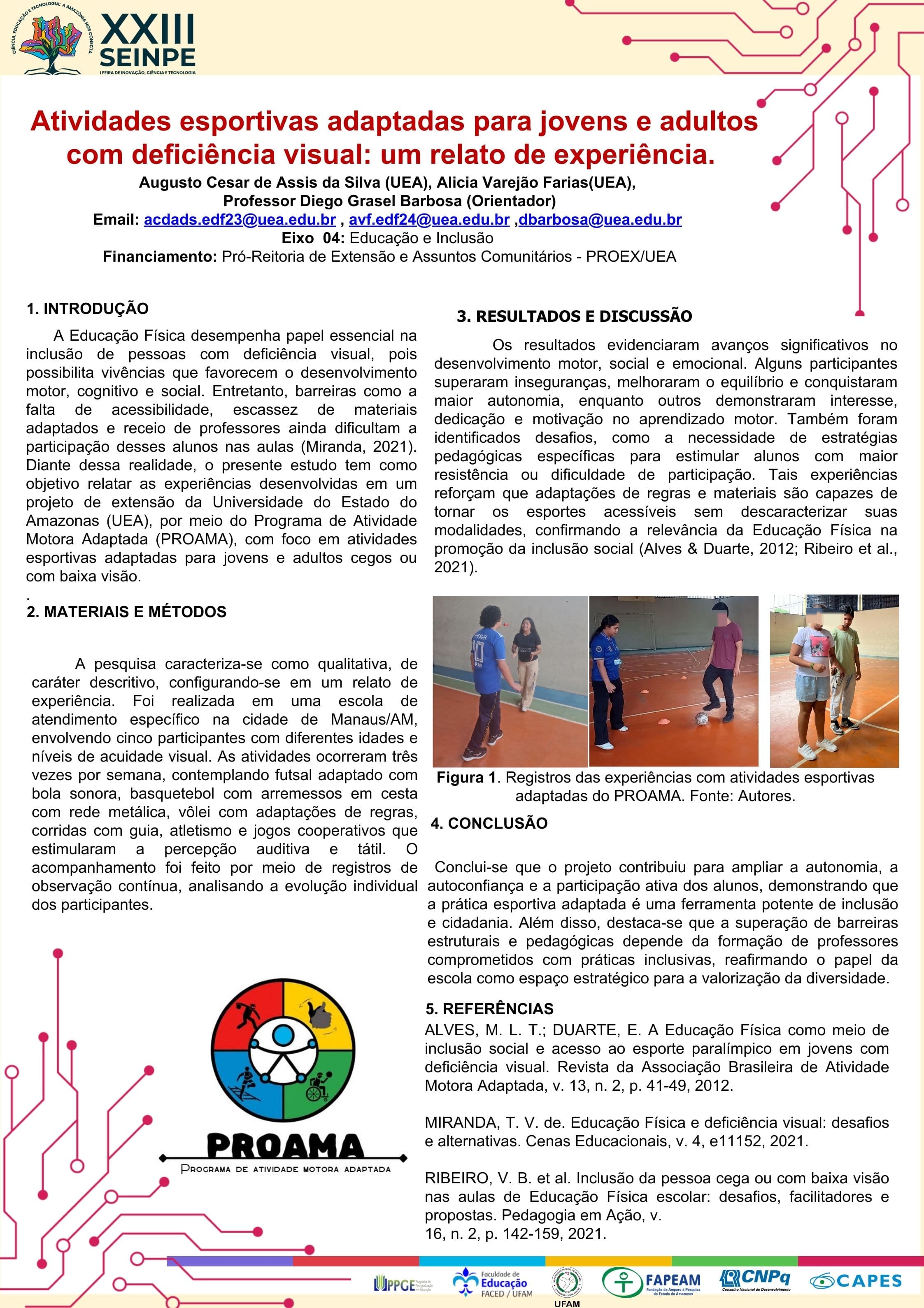 Esta pesquisa relata as experiências oriundas de um projeto de extensão da Universidade do Estado do Amazonas (UEA) no qual foram promovidas atividades esportivas adaptadas e psicomotoras para pessoas com deficiência visual, visando inclusão e autonomia. Os resultados mostraram avanços significativos nos aspectos motor e social dos participantes, destacando a importância da Educação Física como promotora de acessibilidade e cidadania. As experiências revelaram que a superação de barreiras depende da adaptação de materiais e espaços, bem como da formação de professores comprometidos com práticas inclusivas.