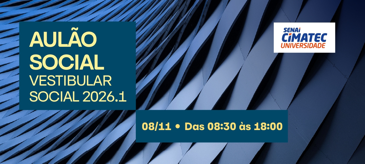 O Aulão Social é uma iniciativa da Universidade SENAI CIMATEC voltada para candidatos inscritos no Vestibular Social 2026.1. Será um dia inteiro de preparação com revisões de conteúdos, simulados, dicas de estudo e dinâmicas motivacionais.