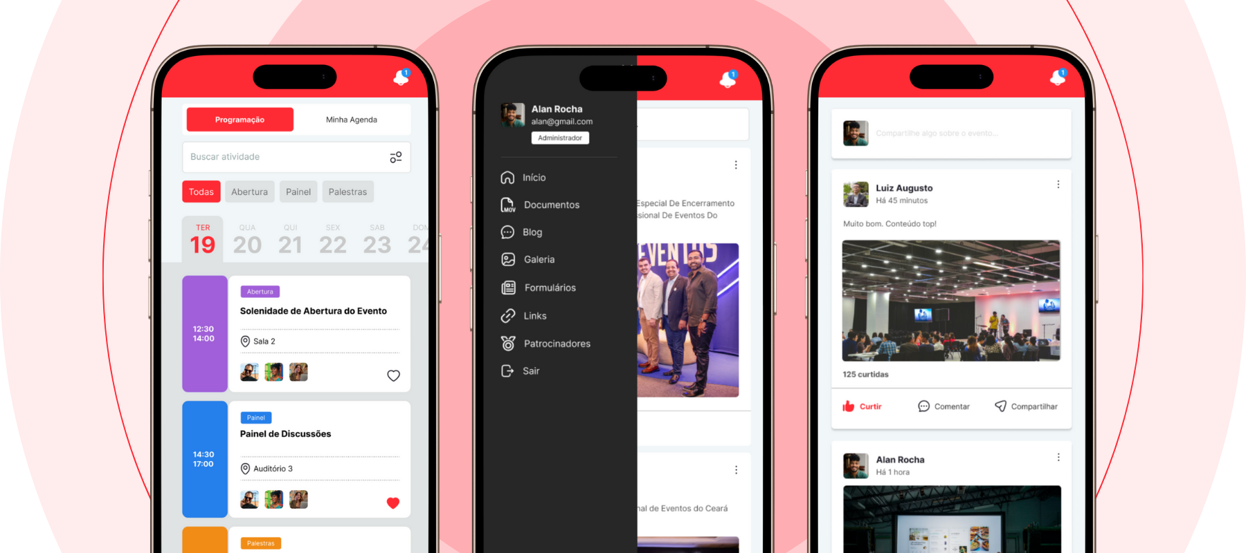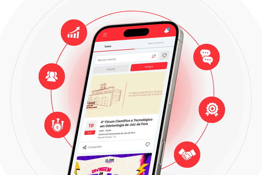 O aplicativo funciona como um verdadeiro ecossistema de eventos, onde você centraliza sua agenda, compartilha conteúdos, mantém o público engajado e fortalece o relacionamento com sua comunidade.