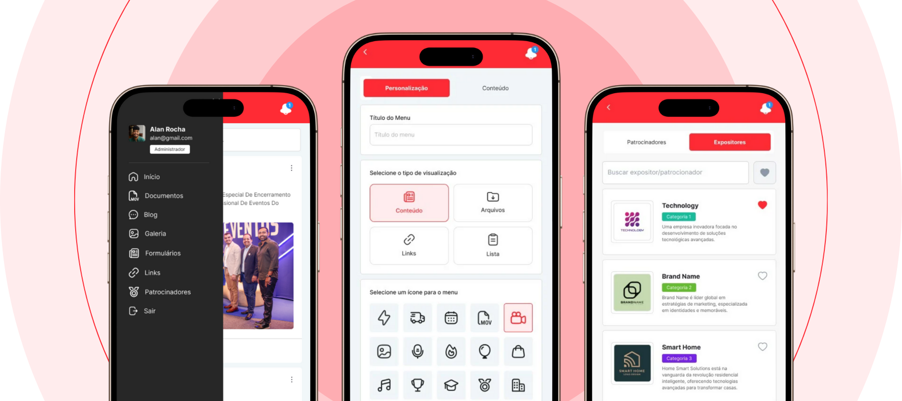 O App Multieventos vai além da agenda e permite a criação de áreas personalizadas no menu, com conteúdos como materiais e documentos, galerias de fotos e vídeos, formulários, páginas institucionais e espaços exclusivos para parceiros e patrocinadores.