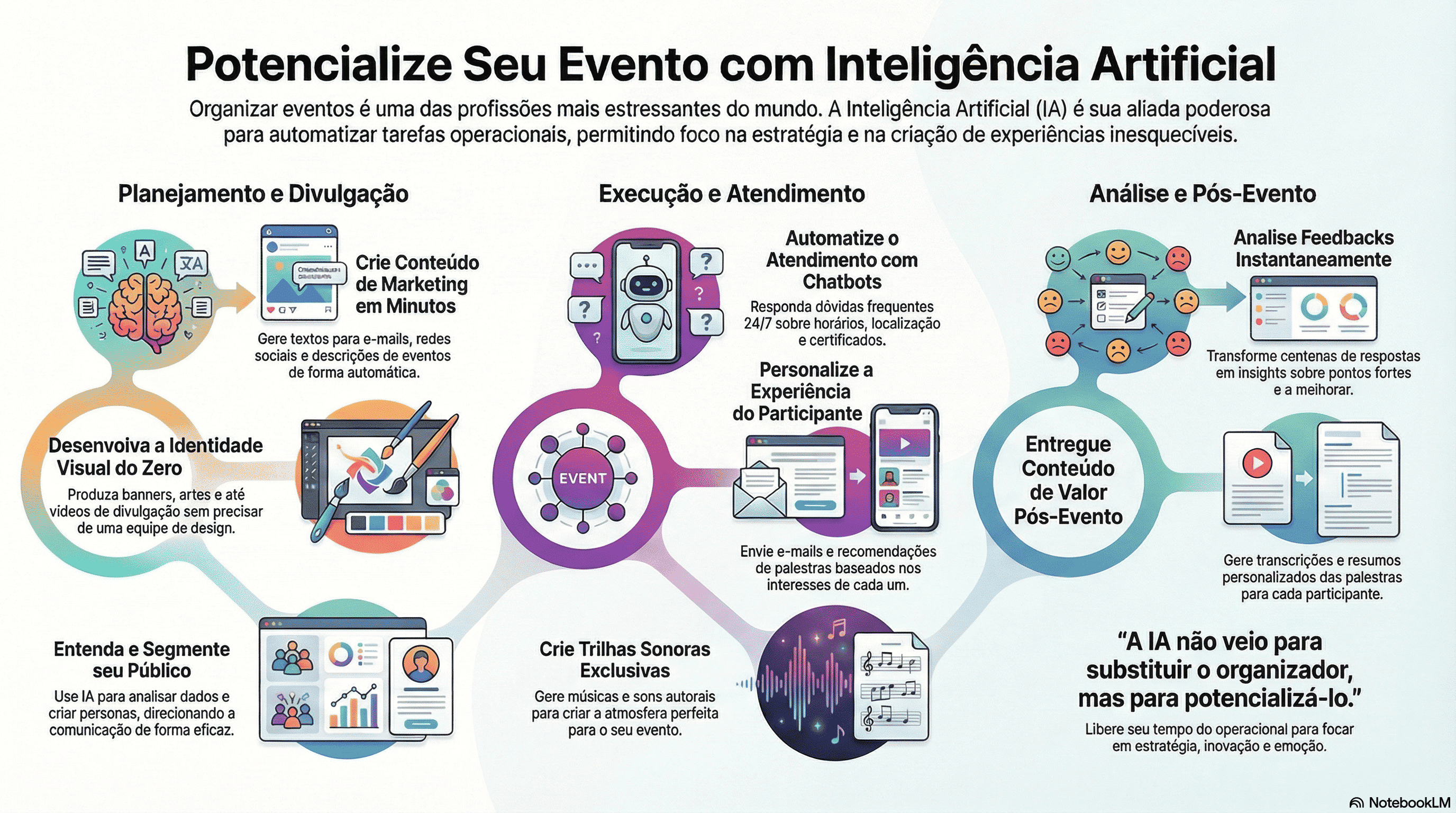 A Inteligência Artificial em eventos não veio para tirar o seu lugar de organizador! Ela veio para devolver seu tempo. Para liberar sua agenda do operacional e permitir que você foque no que ninguém mais pode fazer por você: pensar estrategicamente, inovar, surpreender, emocionar!