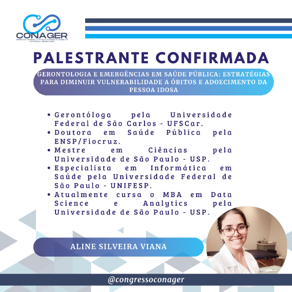 Área de submissãoGerontologia e Emergências em Saúde Pública: Estratégias para diminuir a vulnerabilidade a óbitos e adoecimento da pessoa idosa Palestra · Aline Silveira Viana