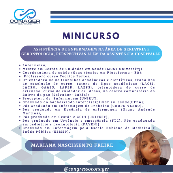 Assistência de enfermagem na área de geriatria e gerontologia, perspectivas além da assistência hospitalar Minicurso · Mariana Nascimento Freire