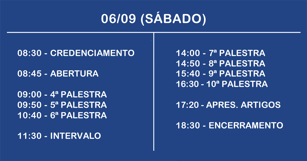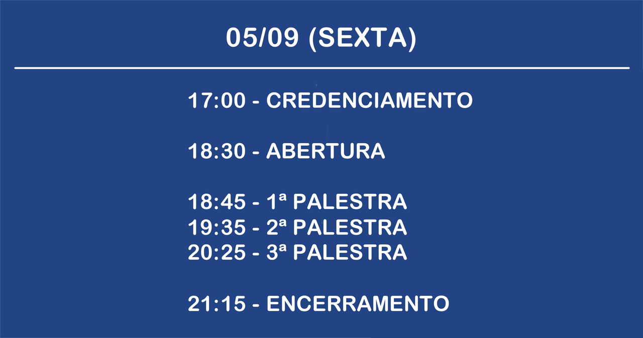 A programação oficial do evento está distribuída em dois dias conforme imagem abaixo. O ingresso do congresso não está incluso com a atração cultural, esse deve ser adquirido de forma separada aqui no site e seção identificada.