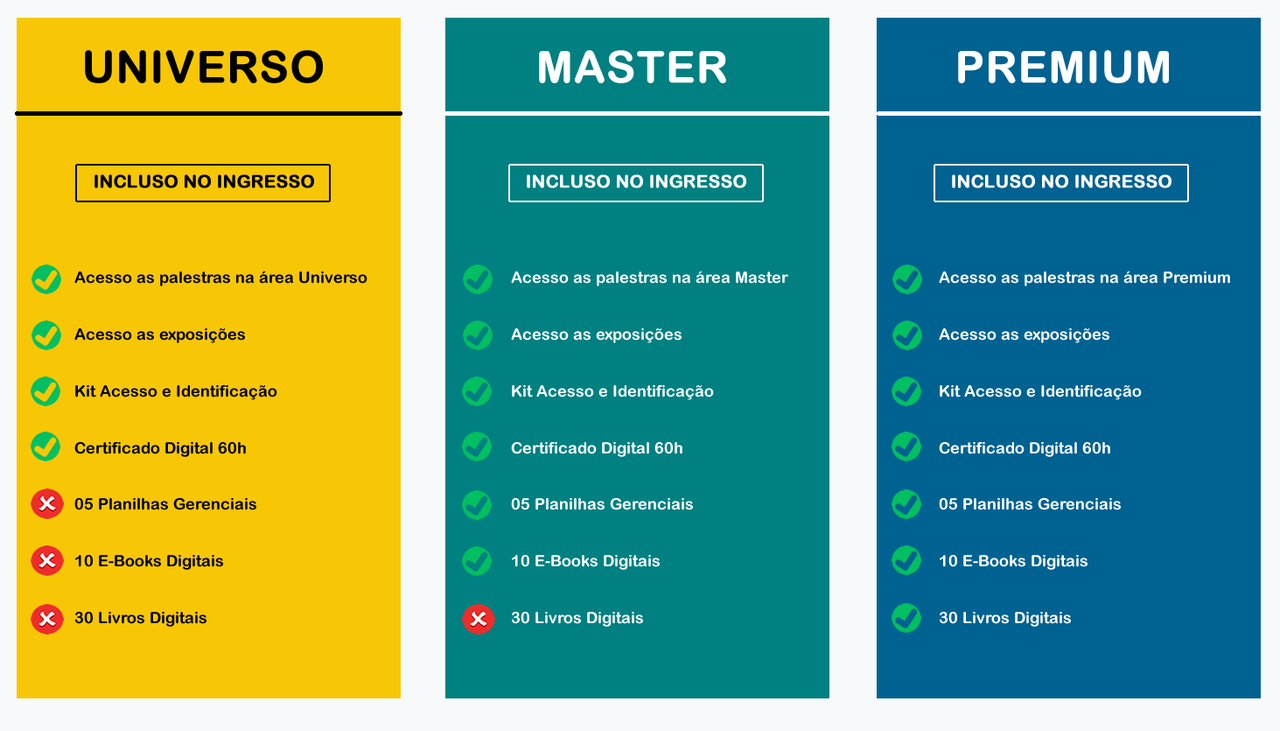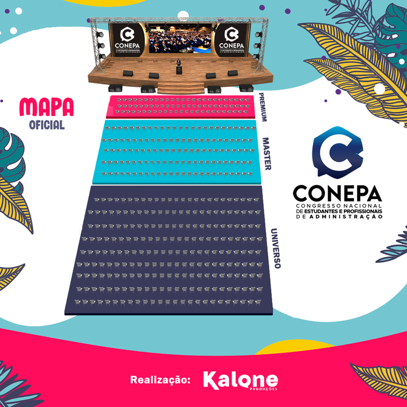 Os setores conforme o mapa, são distribuídos por cores que serão de identificação das pulseiras e com rígido controle no acesso, assim bem como sua orientação para chegar ao setor comprado referente ao Premium, Master e Universo.