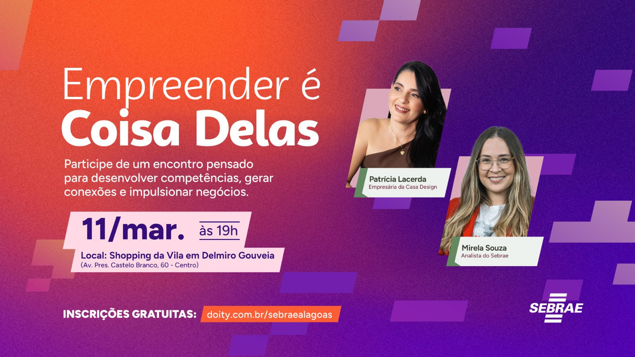 Garanta sua vaga gratuita agora! Porque empreender é coisa delas. E o Sebrae caminha junto com você nessa jornada.
