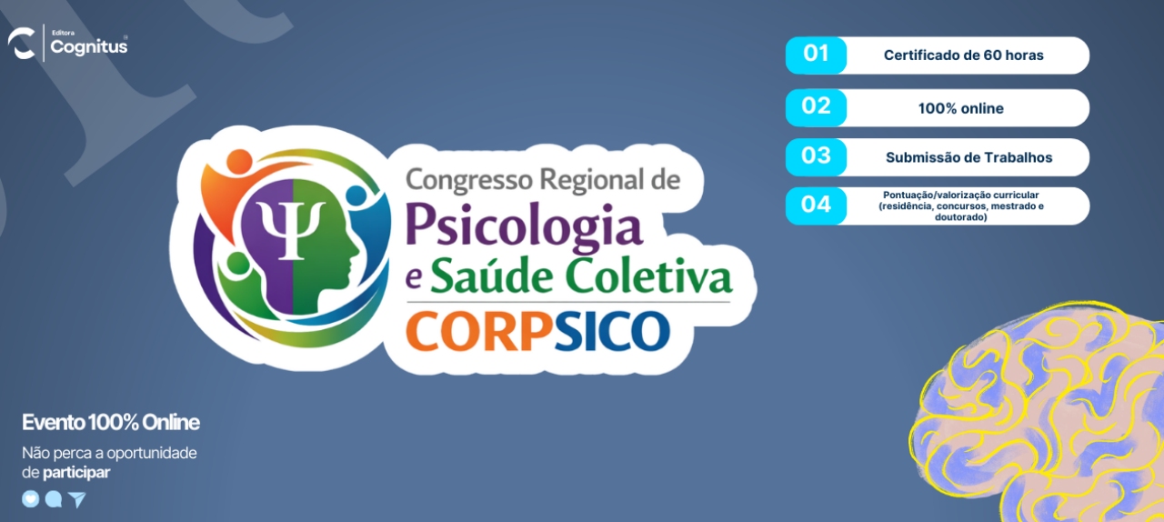 O I Congresso Regional de Psicologia e Saúde Coletiva (CORPSICO) é um evento científico 100% online, que acontecerá nos dias 03 e 04 de julho de 2026, reunindo profissionais, pesquisadores, docentes, estudantes e gestores das áreas de Psicologia, Saúde Coletiva e SUS de todo o Brasil.