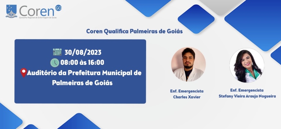 O Conselho Regional de Enfermagem de Goiás (Coren-GO) chega a cidade de Palmeiras de Goiás, levando capacitação e conhecimento para toda a Enfermagem. No próximo dia 30, das 08:00h ás 16:00 horas, o Coren-GO chega com o curso de "Suporte Básico de VIda". O treinamento acontecerá no Auditório da Prefeitura Municipal de Palmeiras de Goiás, localizado na Rua. Americano do Brasil, 149, Palmeiras de Goiás - GO. Garanta a sua incrição.
