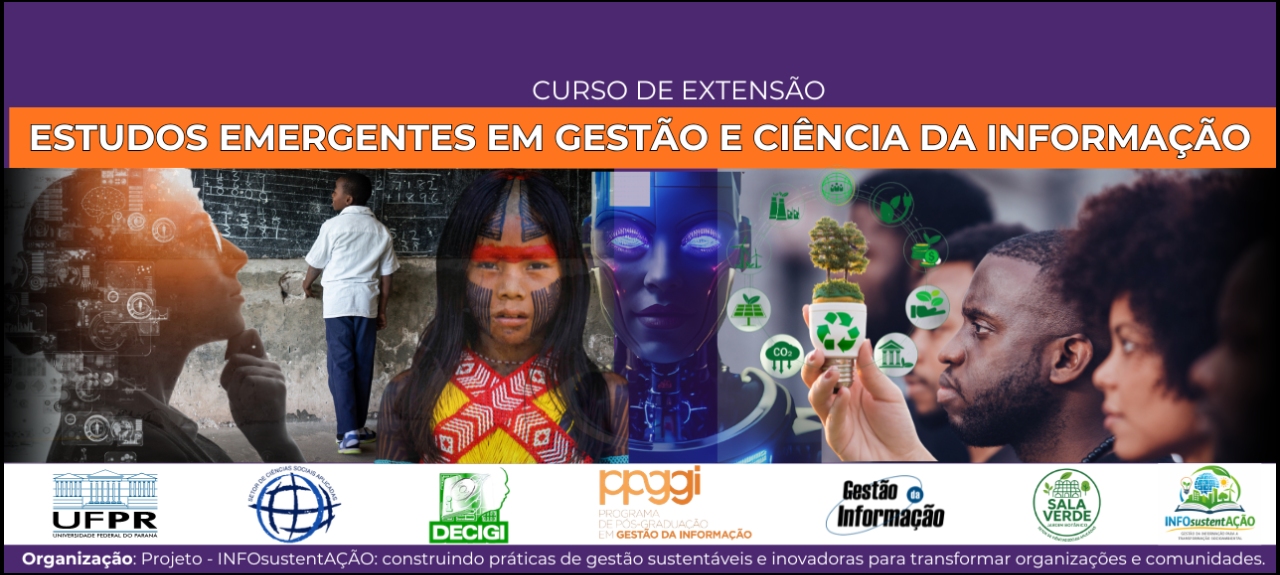 O curso de extensão “Estudos Emergentes em Gestão e Ciência da Informação”, vinculado ao projeto INFOsustentAÇÃO (UFPR), propõe um espaço de reflexão crítica, atualização conceitual e diálogo interdisciplinar sobre temas contemporâneos da área. Realizado em formato online, nas quartas-feiras, com início dia 22 de abril e término dia 08 de julho de 2026, o curso reúne pesquisadores convidados para discutir questões sobre: Ciência Aberta; Ciência Cidadã; Tópicos de Sustentabilidade na Ciência da Informação; Relações étnico-raciais; Justiça Informacional; Ética na Ciência e na Gestão da Informação; Empreendedorismo Social; Povos tradicionais e originários; Estudos emergentes sobre sustentabilidade na Gestão da Informação; Arquivos comunitários; Memória e patrimônio cultural; Desinformação; Integridade da informação; Inteligência Artificial e a produção científica; Humanidades Digitais; Inovação; e Tecnologias da Informação Emergentes na Gestão e Ciência da Informação. Voltado a estudantes de graduação e pós-graduação, pesquisadores e profissionais da área, o curso busca fortalecer redes de colaboração e estimular a produção de reflexões, projetos e soluções inovadoras aplicáveis a gestão de informação. A iniciativa integra ensino, pesquisa e extensão, contribuindo para a formação de profissionais comprometidos com a responsabilidade social da informação e os Objetivos de Desenvolvimento Sustentável (ODS).