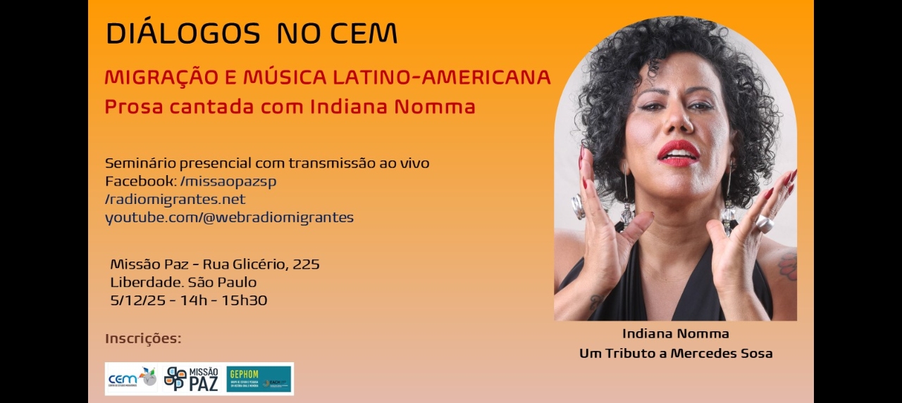 A partir da sua trajetória pessoal, Indiana Nomma falará sobre Migrações, Ditaduras, Música, Brigadas de educação popular, Mercedes Sosa - a voz dos sem voz, La Negra.