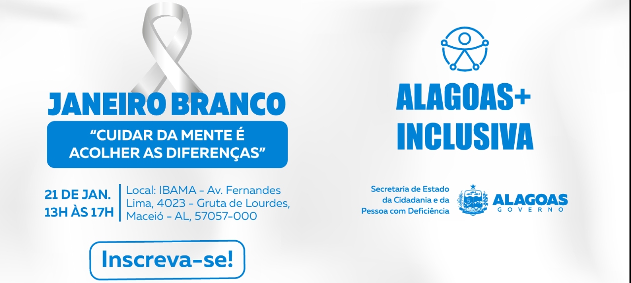 Reconhecendo a relevância de promover espaços de escuta qualificada, acolhimento e diálogo com Pessoas com Deficiência, seus cuidadores, profissionais e servidores públicos, será realizado o encontro “Janeiro Branco: cuidar da mente é acolher as diferenças”, no dia 21 de janeiro, das 13h às 17h, na sala 5, na Escola de Governo de Alagoas.