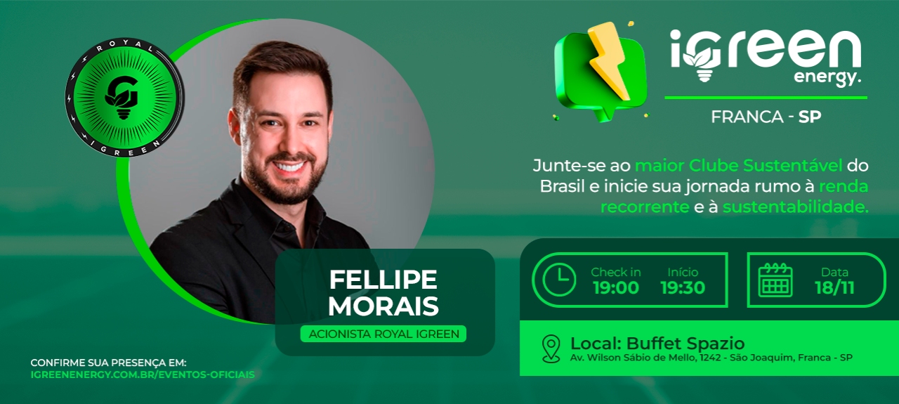 Junte-se a nós neste Evento Presencial iGreen! Descubra como gerar RENDA RECORRENTE através da Economia Sustentável. Participe do evento, aprenda estratégias essenciais para prosperar neste universo. Vamos construir um futuro mais sustentável, juntos!