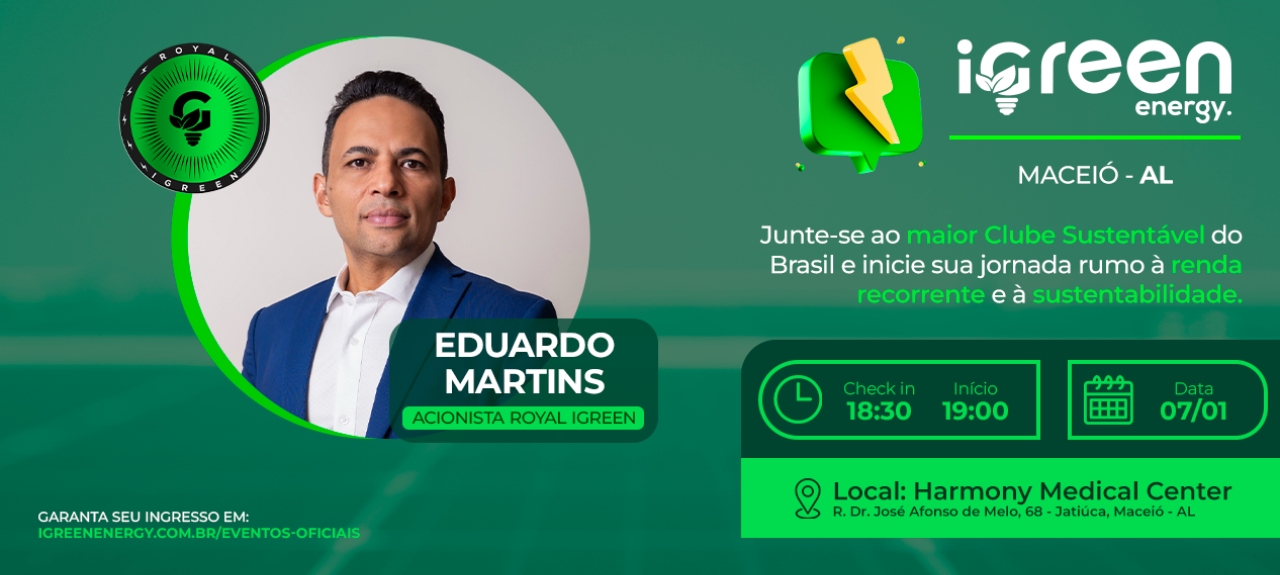 Junte-se a nós neste Evento Presencial iGreen! Descubra como gerar RENDA RECORRENTE através da Economia Sustentável. Participe do evento, aprenda estratégias essenciais para prosperar neste universo. Vamos construir um futuro mais sustentável, juntos!