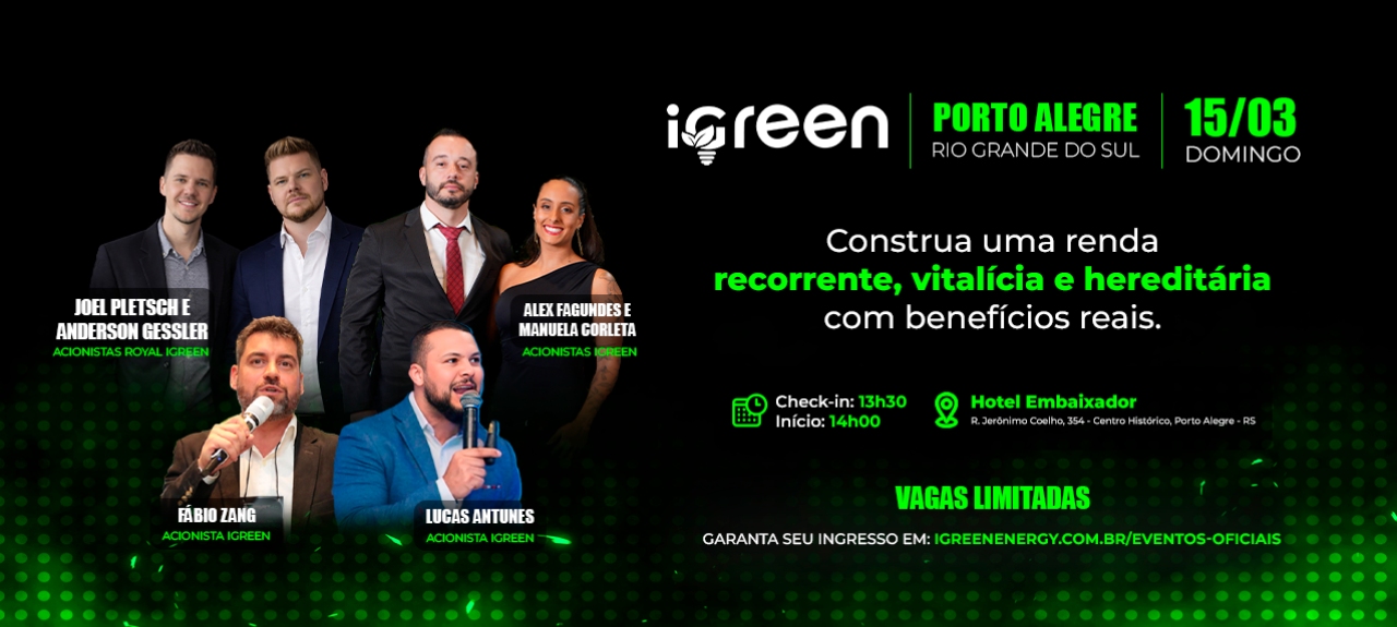 Junte-se a nós neste Evento Presencial iGreen! Descubra como gerar RENDA RECORRENTE através da Economia Sustentável. Participe do evento, aprenda estratégias essenciais para prosperar neste universo. Vamos construir um futuro mais sustentável, juntos!