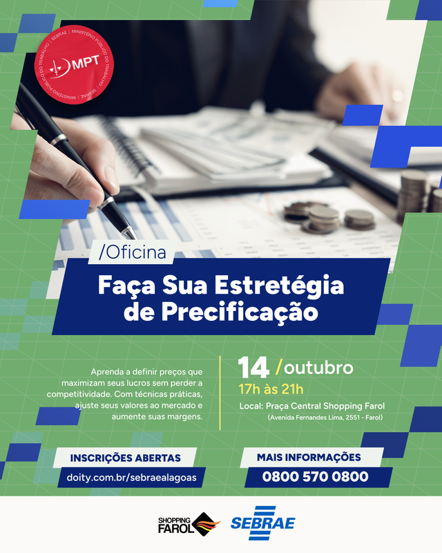 Mas e se precificar fosse menos um quebra-cabeça e mais um mapa do tesouro? Com a Oficina Faça sua Estratégia de Precificação do Sebrae Alagoas, você descobre que preço não é só etiqueta: é estratégia, é caminho, é impulso para crescer — e crescer bonito, sustentável, do seu jeito.
