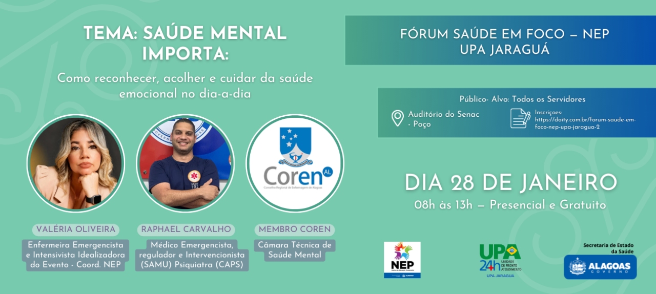 O Fórum Saúde em Foco — NEP UPA Jaraguá será realizado com o tema central “Saúde Mental Importa: Como reconhecer, acolher e cuidar da saúde emocional no dia a dia”. Reunindo profissionais para uma reflexão coletiva. O fórum visa promover a conscientização, o fortalecimento emocional e o desenvolvimento de atitudes práticas para o cuidado com a saúde mental. Estimulando a capacidade de reconhecer sinais de sofrimento psíquico, acolher com empatia e implementar estratégias de autocuidado e apoio no cotidiano pessoal e profissional.