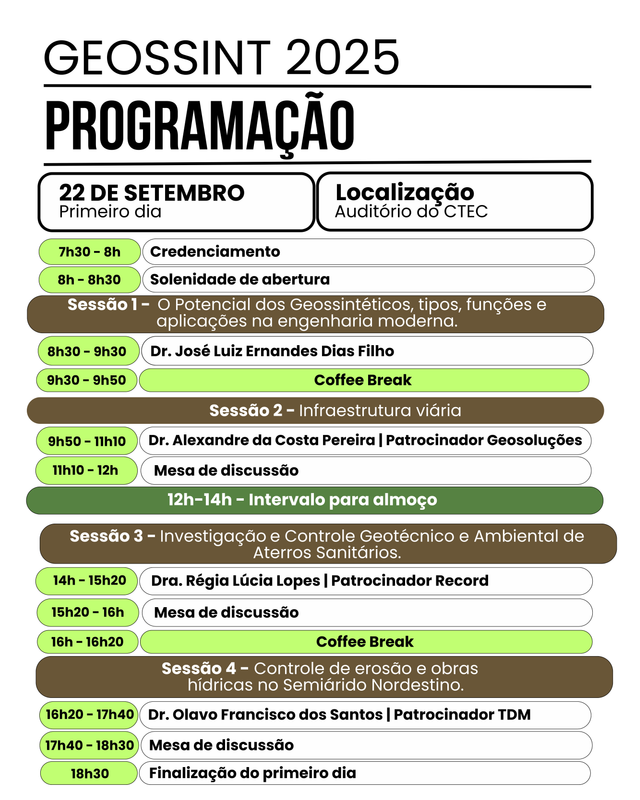 O II Simpósio Regional em Geossintéticos – GEOSSINT NORDESTE é um evento técnico-científico dirigido a engenheiros, acadêmicos, empresas e órgãos públicos da região Nordeste, com foco em inovação para aplicações de geossintéticos. Promovido pela IGS Brasil, promete aprofundar discussões sobre soluções sustentáveis e eficientes em pavimentação, contenção, drenagem, obras de arte especiais, mineração, meio ambiente e obras sanitárias.