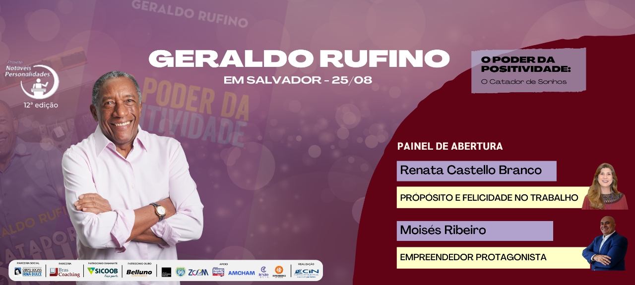 A CIN Capital Intelectual, já trouxe à Salvador para palestrar grandes nomes como: Bernardinho, Roberto Justus, Mario Sergio Cortella, Leandro Karnal, Clóvis de Barros Filho, Luiza Helena Trajano (Magazine Luiza), Monja Coen, James Hunter (O Monge e o Executivo), Maestro João Carlos Martins, Tim Galley (O precursor do Coaching) e outros, traz agora em sua 12ª edição do Projeto Notáveis Personalidades, GERALDO RUFINO!
