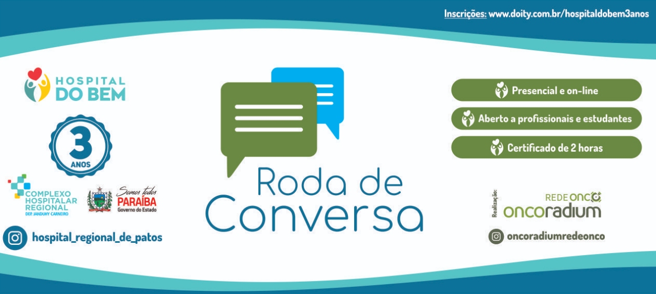 O Hospital do Bem, ala Oncológica do Complexo Hospitalar Regional Deputado Janduhy Carneiro em Patos (PB) completa 03 anos de fundação, para essa comemoração estamos realizando algumas atividades em benefício da comunidade científica, sendo assim apresentamos a RODA DE CONVERSA que tem por objetivo a transmisssão de conhecimento através de áreas multriprofissionais por profissionais que atuam diretamente com Oncologia em nosso serviço.