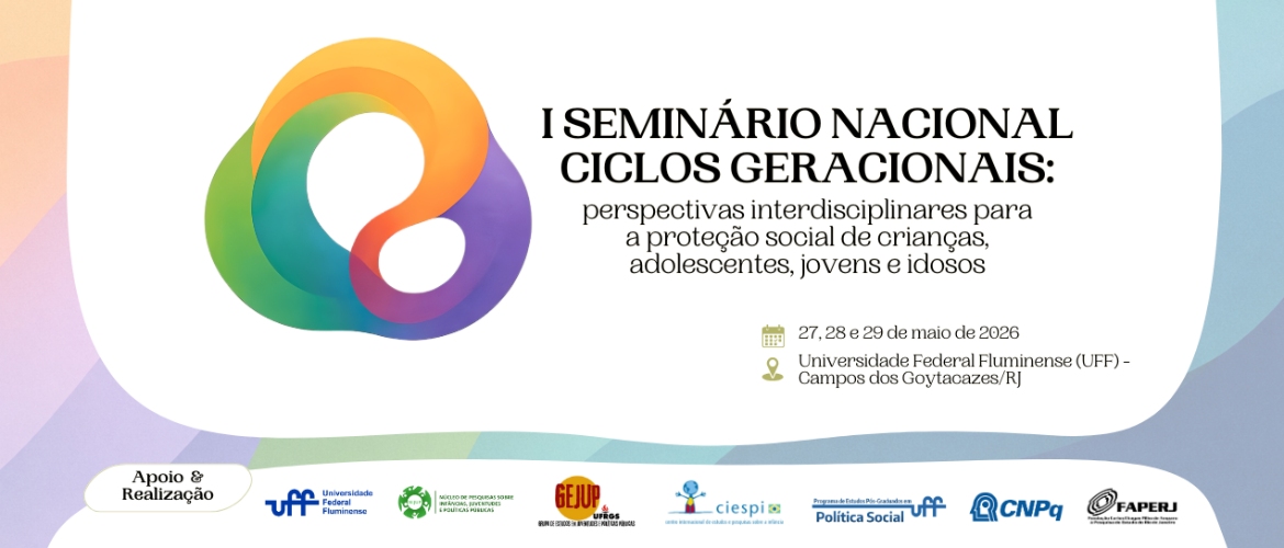 É com grande alegria que anunciamos a realização do I Seminário Nacional Ciclos geracionais: perspectivas interdisciplinares para a proteção social de crianças, adolescentes, jovens e idosos, promovido pelo Núcleo de Pesquisa sobre Infâncias, Juventudes e Políticas Públicas (NIJUP/UFF), pelo Grupo de Estudos em Juventude e Políticas Públicas (GEJUP/UFRGS) e pelo Centro Internacional de Estudos e Pesquisas sobre a Infância (CIESPI/PUC-Rio), a ser realizado na Universidade Federal Fluminense, na cidade de Campos dos Goytacazes-RJ.