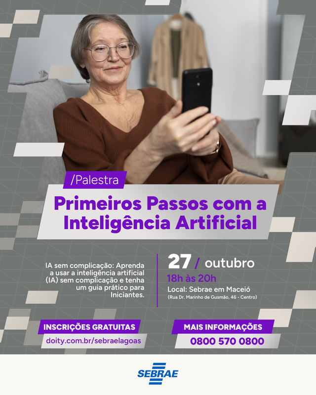 Pensando nisso, o Sebrae Alagoas preparou a palestra "Primeiros Passos com a Inteligência Artificial", um evento pensado especialmente para quem deseja conhecer, de forma simples e objetiva, o universo da IA.