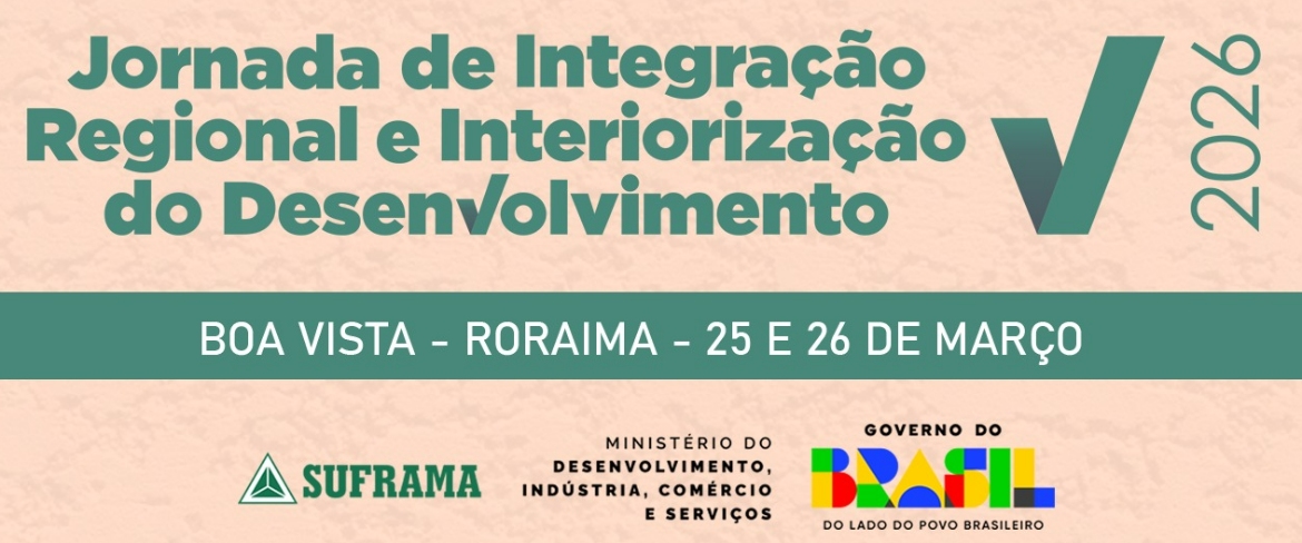 A Suframa realiza a Jornada de Integração Regional e Interiorização do Desenvolvimento em Boa Vista/ RR, nos dias 25 e 26 DE MARÇO, com o objetivo de fortalecer a ação da Suframa, da Sudam e do Banco da Amazônia, os três principais entes federais de desenvolvimento da Amazônia, e melhorar o ambiente de negócios em nossa região.