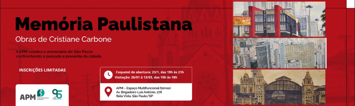 A Associação Paulista de Medicina, por meio de sua Diretoria Cultural, tem a honra de convidá-lo(a) para o coquetel de abertura da exposição “Memória Paulistana: Obras de Cristiane Carbone”, uma celebração artística em homenagem à história e ao aniversário da cidade de São Paulo.