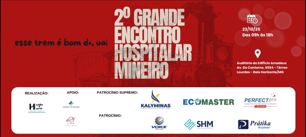 O 2º Grande Encontro Hospitalar Mineiro - Gestão em Hotelaria Hospitalar, Facilities e Controle de Infecção, acontecerá no dia 23 de outubro de 2025, em Belo Horizonte/MG, das 9h às 18h. Com investimento de R$ 110,00, os participantes terão acesso a um ciclo de palestras (manhã e tarde), café de boas-vindas, coffee break manhã e tarde e certificado de participação.