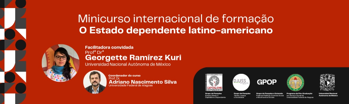 O Programa de Pós-Graduação em Serviço Social da Universidade Federal de Alagoas (PPGSS/UFAL), por meio dos grupos de pesquisa Estado, Direito e Capitalismo Dependente (GPEDCD), Direito, Justiça e Sociedade (DJUSS) e Políticas Públicas, Controle Social e Movimentos Sociais (G-POP) apresenta o "minicurso internacional de formação: o Estado dependente latino-americano", a ser ministrado pela Profª Drª Georgette Ramírez Kuri, da Universidad Nacional Autónoma de México (UNAM).