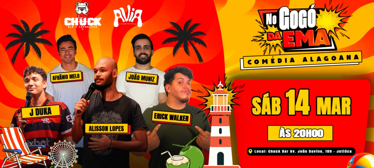 Com apoio da Avia Produções, o No Gogó da Ema promete uma noite de humor com sotaque, histórias do cotidiano alagoano e aquela identificação imediata que só a comédia local proporciona.