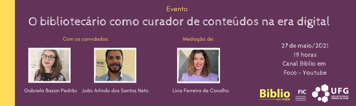 O evento "O Bibliotecário como curador de conteúdos na era digital" promovido pelo curso de Biblioteconomia da Universidade Federal de Goiás, com apoio do projeto de extensão Biblio em Foco, tem como propósito expor e debater a temática com a convidada Gabriela Pedrão – doutora em Ciência da Informação e bibliotecária; e o convidado João Arlindo dos Santos Neto – doutor em Ciência da Informação, professor da UEL e pesquisador da área de mediação da informação.