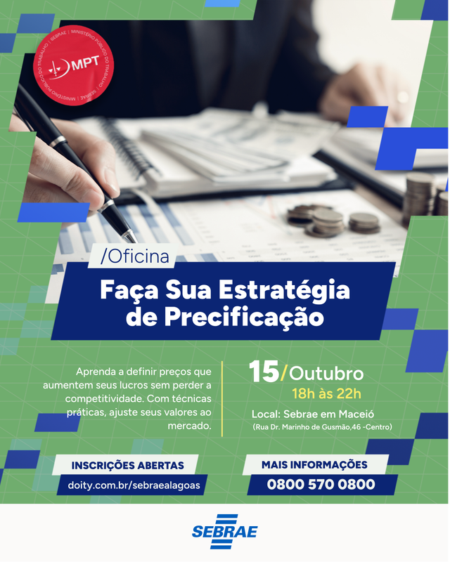 Agora, imagine se precificar deixasse de ser um quebra-cabeça e se transformasse em um verdadeiro mapa do tesouro. Na Oficina Faça sua Estratégia de Precificação do Sebrae Alagoas, você vai descobrir que preço não é apenas uma etiqueta: é estratégia, é direção, é o impulso que faltava para crescer de forma sustentável, do seu jeito.