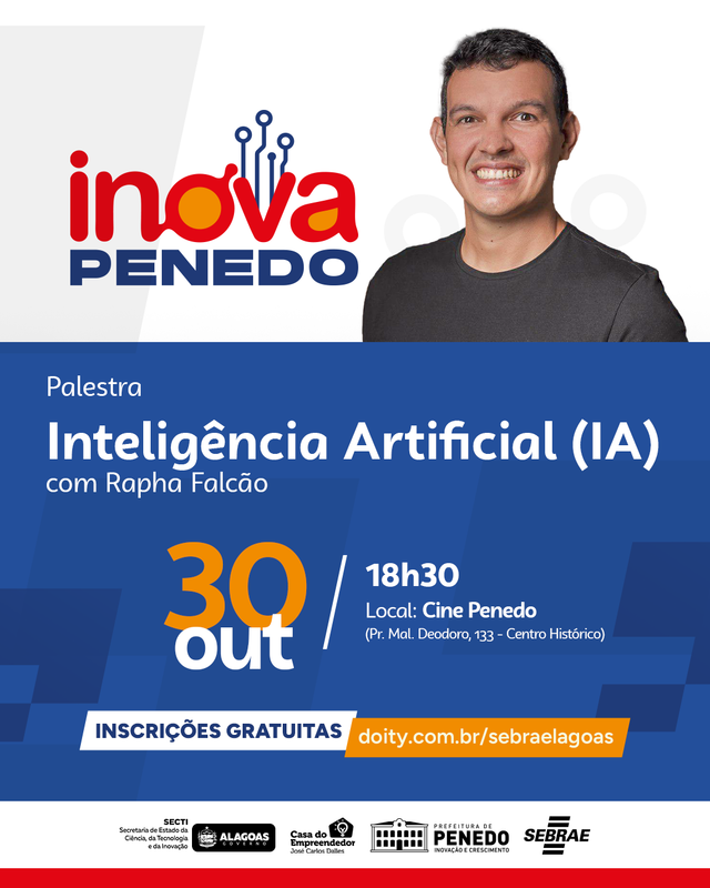 Durante a Semana de Inovação de Penedo, o especialista em marketing digital e inovação Rapha Falcão apresenta a palestra “Inteligência Artificial: o futuro é agora”, um convite para entender como a IA está transformando o mundo dos negócios, da comunicação e da educação.