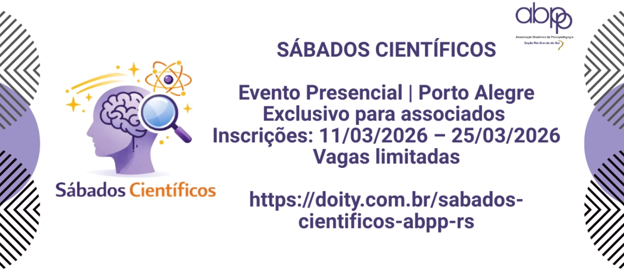 Sábados Científicos é um evento de Formação Psicopedagógica destinado aos Associados da ABPp-RS que ocorrerá mensalmente de forma presencial. No Edifício Quinta Avenida Center, Rua Vinte e Quatro de Outubro, 111 | Sala 706 | Bairro Moinhos de Vento | Porto Alegre-RS. O evento está organizado em dois módulos.