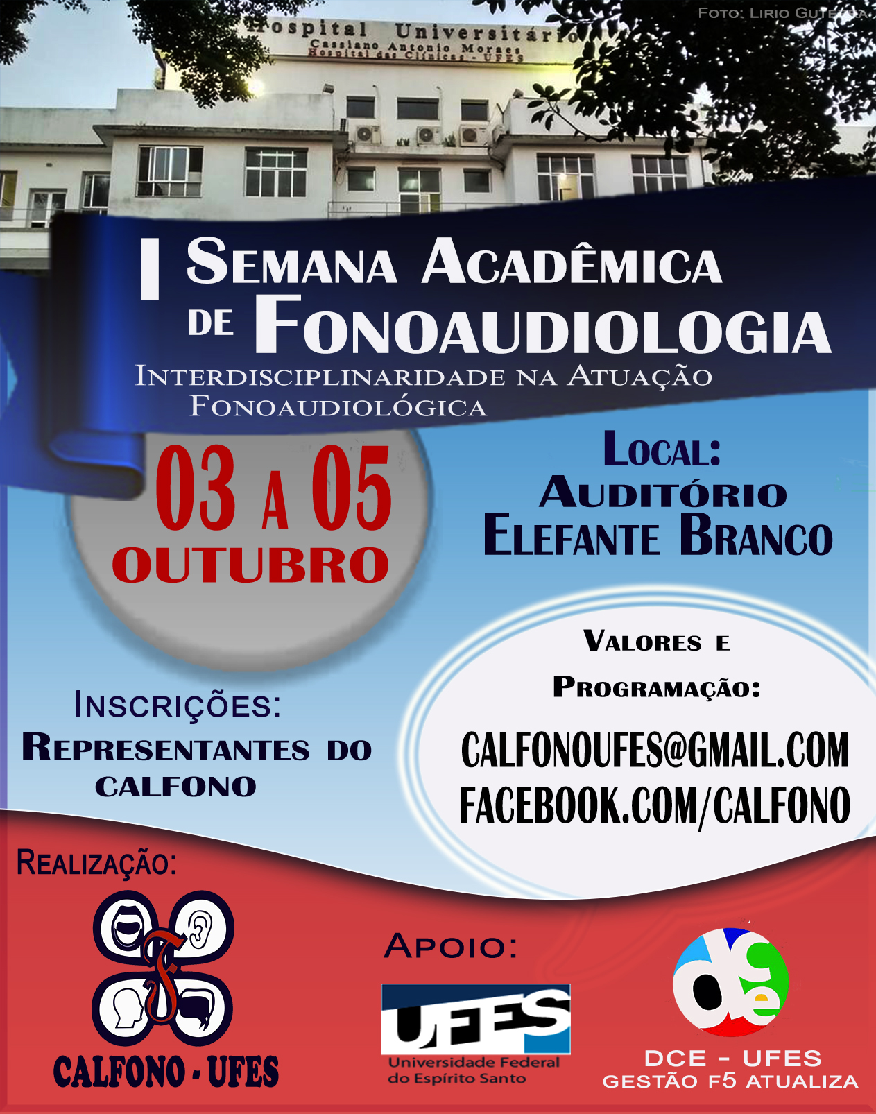 O Centro Acadêmico Livre de Fonoaudiologia (CALFONO) - UFES, representante dos acadêmicos do curso de Fonoaudiologia da Universidade Federal do Espírito Santo (UFES), vem ao longo de três anos de fundação, defender os interesses das/os estudantes dentro e fora da Universidade. E vem propor a I Semana Acadêmica de Fonoaudiologia da UFES, com o tema "Interdisciplinaridade na atuação Fonoaudiológica". O evento faz parte de uma grade de atividades que os representantes do CALFONO estão organizando para os anos de 2016 e 2017. Nesse sentido, a I Semana Acadêmica de Fonoaudiologia constitui-se em um espaço conquistado pelos estudantes e construído coletivamente. Dessa forma, a Semana Acadêmica propõe desenvolver um importante papel, proporcionando momentos para a discussão entre acadêmicos na abordagem de questões relevantes através de palestras e mesas redondas com diversos profissionais de prestígio da área da Saúde, buscando despertar nos estudantes a preocupação de formar-se enquanto ser social e agente de transformação.