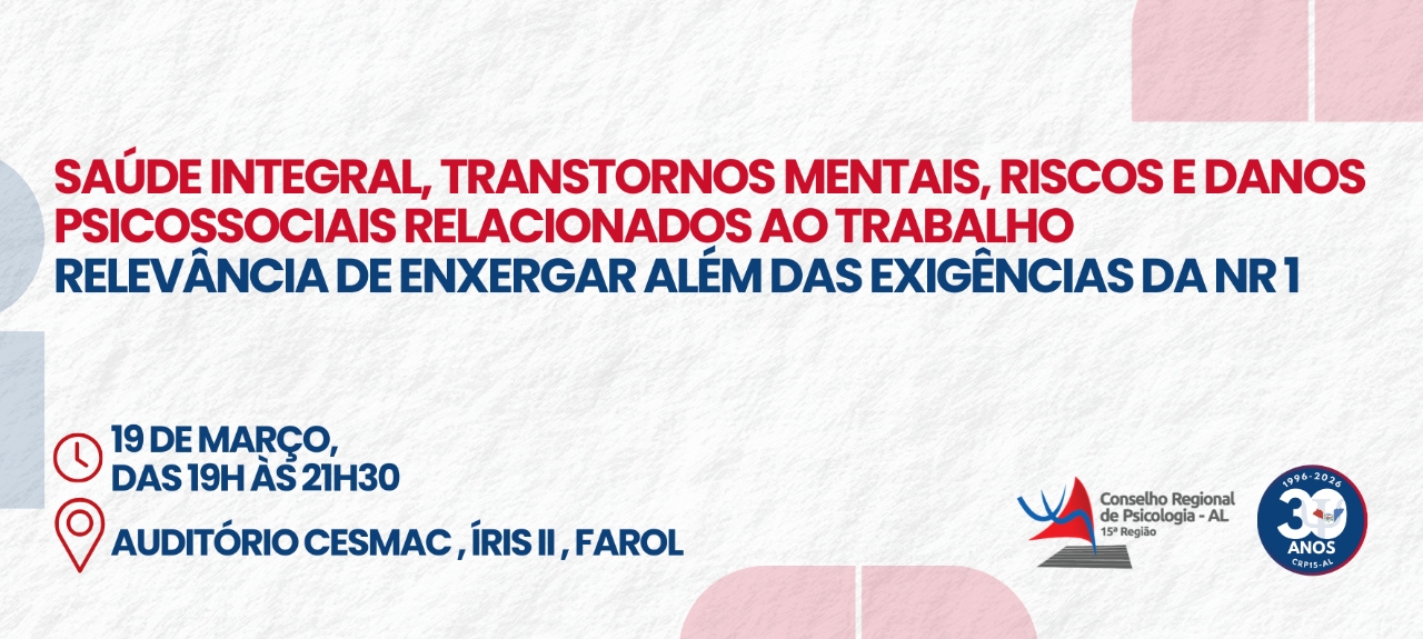 Um encontro para ampliar o olhar sobre saúde mental no contexto laboral, discutir responsabilidades, desafios contemporâneos e fortalecer a atuação da Psicologia frente às demandas do mundo do trabalho.