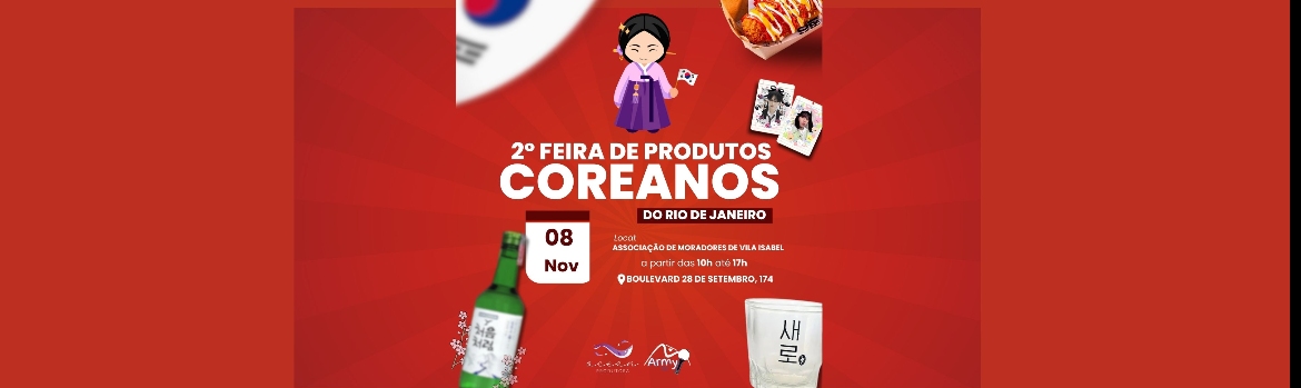 No dia 08 de novembro de 2025, das 10h às 17h, a Associação de Moradores de Vila Isabel se transforma em um verdadeiro pedacinho da Coreia. Você poderá encontrar: