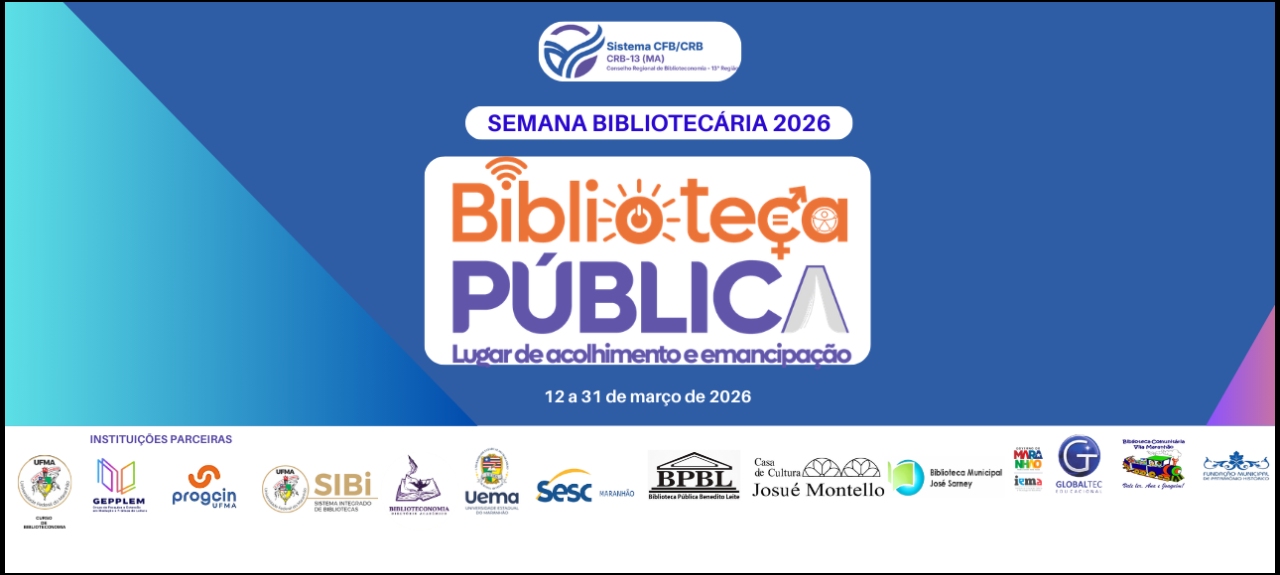 Realizada entre os dias 12 e 31 de março de 2026, a programação é promovida pelo Sistema CFB/CRB — Conselho Regional de Biblioteconomia 13ª Região (CRB-13), em parceria com o Curso de Biblioteconomia da UFMA, o Sistema Integrado de Bibliotecas (SIBi/UFMA), a Biblioteca Pública Benedito Leite (BPBL), a Biblioteca Municipal José Sarney, a Casa de Cultura Josué Montello, a Universidade Estadual do Maranhão (UEMA), o SESC Maranhão, o IEMA, o GEPPLEM/UFMA, a Fundação Municipal de Patrimônio Histórico, o PROGCIN/UFMA, a Biblioteca Comunitária Vila Maranhão, o GLOBALTEC Educacional e o Governo do Estado do Maranhão.