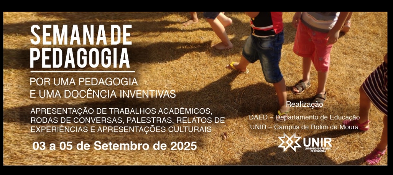A Semana de Pedagogia 2025 acontecerá no Campus de Rolim de Moura da Fundação Universidade Federal de Rondônia (UNIR) entre os dias 03 e 06 de setembro. Organizada pelo Departamento de Educação, a Semana de Pedagogia traz como tema: “Por uma Pedagogia e docência inventivas”. O evento propõe a reflexão e o debate sobre os desafios da inventividade docente na atualidade que permeiam o campo da Pedagogia. Dentre as atividades previstas estão: a comunicação e publicação de trabalhos científicos, palestras, mesas-redondas, apresentações culturais, mostra de fotografias, lançamento de livros e roda de conversas. Com o intuito de trazer os egressos e comunidade acadêmica para pensar juntos sobre a profissão docente e a Pedagogia.