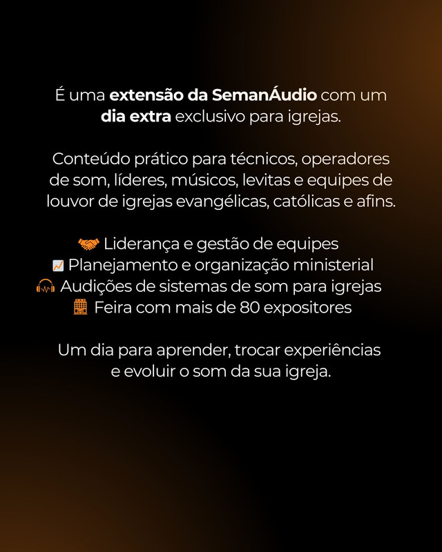 Na palestra sobre Amplificadores Classe D, Cleber apresenta os fundamentos da amplificação por comutação, destacando eficiência, desempenho térmico e qualidade sonora. Também aborda aplicações práticas em sistemas de PA, desmistificando conceitos técnicos e mostrando tendências e inovações que estão moldando o futuro da amplificação profissional.