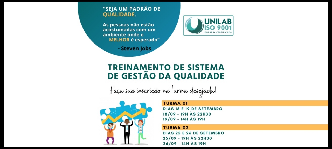 O treinamento sobre o sistema de gestão da qualidade da UNILAB é indispensável a todos os colaboradores da empresa, pois somente através do esforço coletivo podemos prestar um serviço de excelência no diagnóstico, capaz de atender nossa comunidade e proporcionar o crescimento e melhoria da empresa e de seus profissionais.