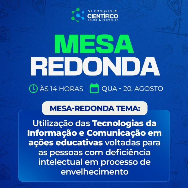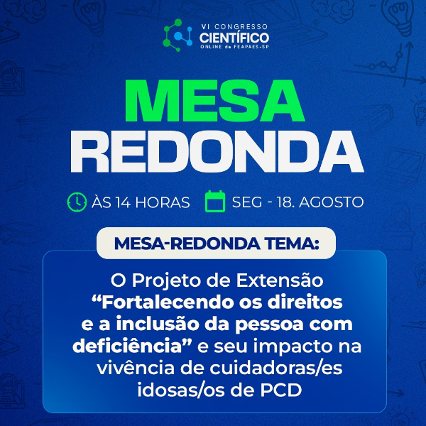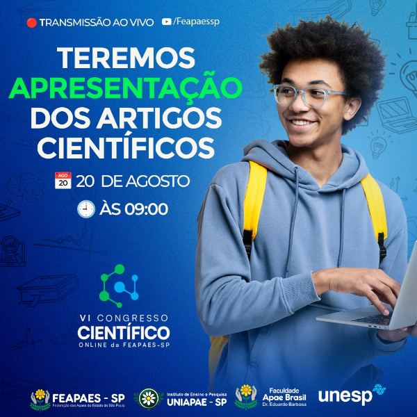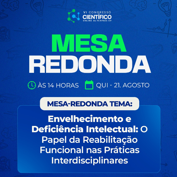 A Federação das APAEs do Estado de São Paulo (FEAPAES-SP) realizará no período de 18 a 21 de agosto de 2025, o VI Congresso Científico Online da Federação das APAEs do Estado de São Paulo, tendo como tema “Interfaces da Longevidade: Diálogos sobre o Envelhecimento de pessoas com Deficiência Intelectual e Autismo”.