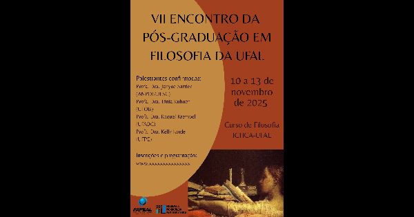 O VII Encontro do Programa de Pós-Graduação em Filosofia (PPGFIL) é evento dedicado ao compartilhamento de pesquisas e à socialização acadêmica da comunidade filosófica e científica da Universidade Federal de Alagoas (UFAL) e sociedade afora. O evento tem como objetivo promover o diálogo entre docentes, discentes e pesquisadores de diferentes instituições, fomentando debates sobre temas clássicos e contemporâneos da filosofia, em suas diversas áreas e tradições.