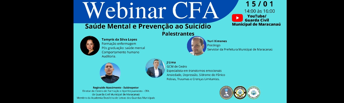 O Centro de Formação e Aperfeiçoamento – CFA da Guarda Civil Municipal de Maracanaú, criado pela Lei nº 3.090, de 08 de dezembro de 2021, promoverá o Webinário sobre Saúde Mental e Prevenção ao Suicídio no Canal da Guarda Civil Municipal de Maracanaú no YouTube no dia 15 de Janeiro de 2025, das 14:00 às 16:00